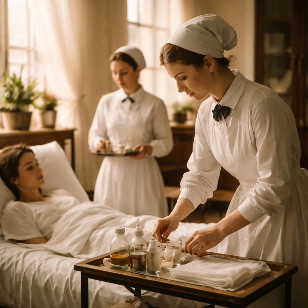それまでの看病との大きな違いは、経験や善意だけではなく、知識と技術に基づいて患者を支える点にあります。衛生、観察、記録、医師との連携、環境管理などを学び、実地訓練を経て現場で働く看護師が、トレインドナースでした。